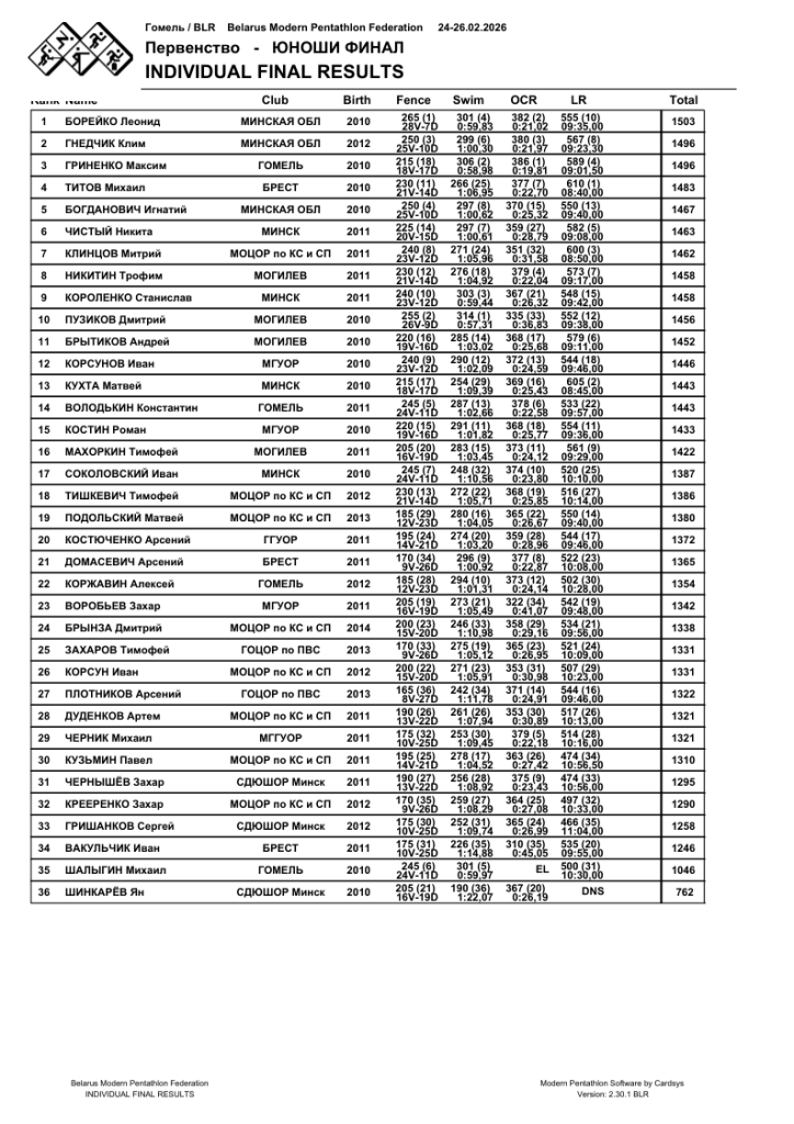 Технические результаты финала Открытого первенства Республики Беларусь до 17 лет в личном зачёте юношей.
