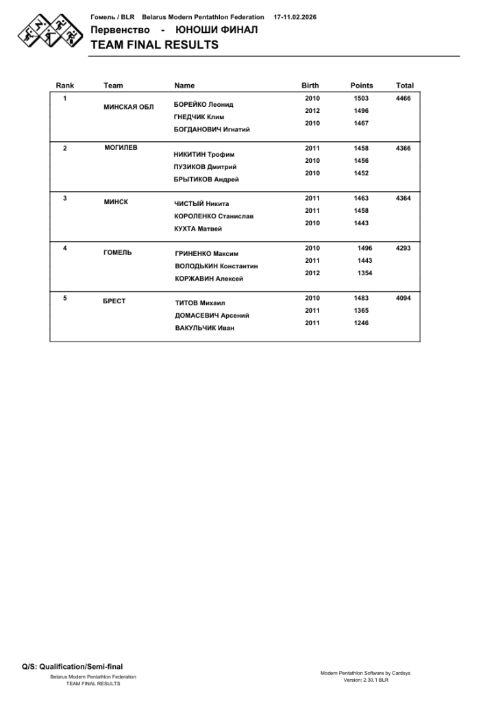 Технические результаты финала Открытого первенства Республики Беларусь до 17 лет среди юношей в командном зачёте.