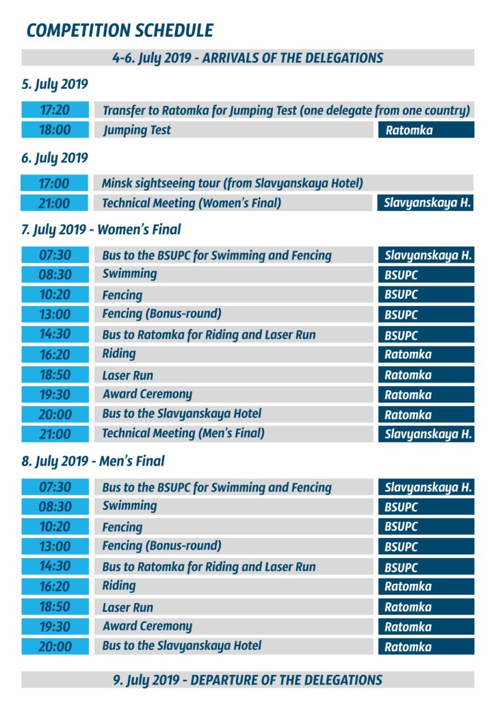 July 7-8, 2019 in the Republic of Belarus on the basis of the educational establishment ”Belarusian State University of Physical Culture“ (109B Pobediteley Ave.) and the establishment of the ”Republican Center for Olympic Training in Equestrian Sports and Horse Breeding“ (Ratomka St., 136 Koritsky St.) will take place International BELARUS OPEN 2019 Olympic Ranking Competitions, organized by the Ministry of Sports and Tourism of the Republic of Belarus, Minsk Regional Executive Committee, Minsk Сity Executive Committee, Belarusian Federation of Modern Pentathlon.
